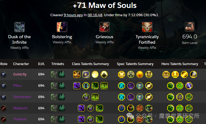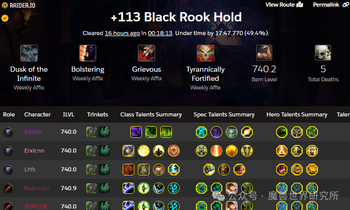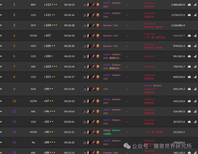 更夸张的是,排行榜前 12 名被同一支国服团队包揽,从 + 113 层一路往下,每层都牢牢占据榜首靠谱配,这支队伍的肝法我们也介绍过了——魔兽:国服仙人成全球首位999级神器玩家!干爆100多层大秘!