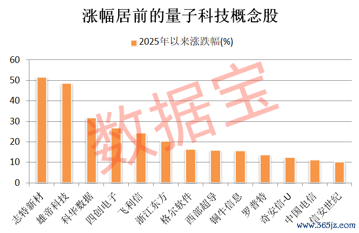 志特新材累计涨幅达到51.5%,排在第一位。今年一季度,公司实现净利润0.25亿元,同比扭亏为盈。2025年3月,公司与量子科技长三角产业创新中心、合肥微观纪元数字科技有限公司签订《战略合作协议》;2025年4月,公司与微观纪元共同设立合资公司上海志特纪元新材料科技有限公司,打造“量子+AI”材料研发新范式。