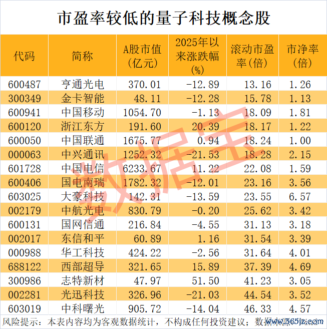 据证券时报·数据宝统计,A股市场涉及量子科技产业的概念股超60只,截至5月30日收盘,概念股合计A股市值2.02万亿元。三大电信巨头中国移动、中国联通、中国电信均在量子科技领域有布局。